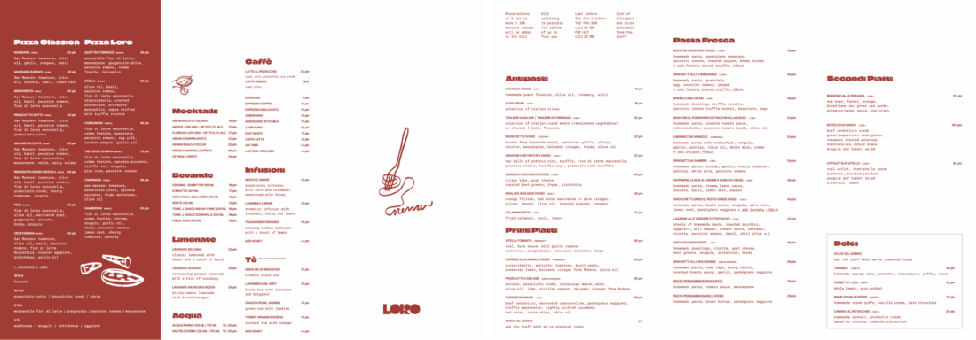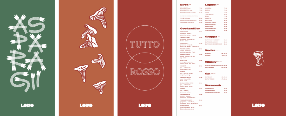 LORO to modna restauracja, której misją jest dawanie gościom przyjemności w stylu dolce vita. Identyfikacja LORO miała być zarówno nowoczesna, jak i kojarząca się sentymentalnie z włoskimi restauracjami znanymi z filmów i wspominanymi po wakacjach. Dla LORO zaprojektowałem logo, reklamę zewnętrzną, ilustracje wykorzystywane w mediach społecznościowych, ubrania załogi, zestaw kart menu oraz wiele innych detali uzupełniających branding i wspomagających go w marketingu.