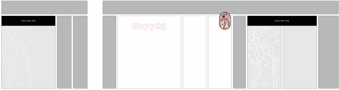 The name of this Warsaw SPA comes from the address where it is located, on Ukryty Raj Street (“Hidden Paradise”). Drawing on this symbolism, we created a logo depicting Eve at the moment of temptation. For Ukryty Raj, I designed the logo, a set of printed materials, and an outdoor advertisement.