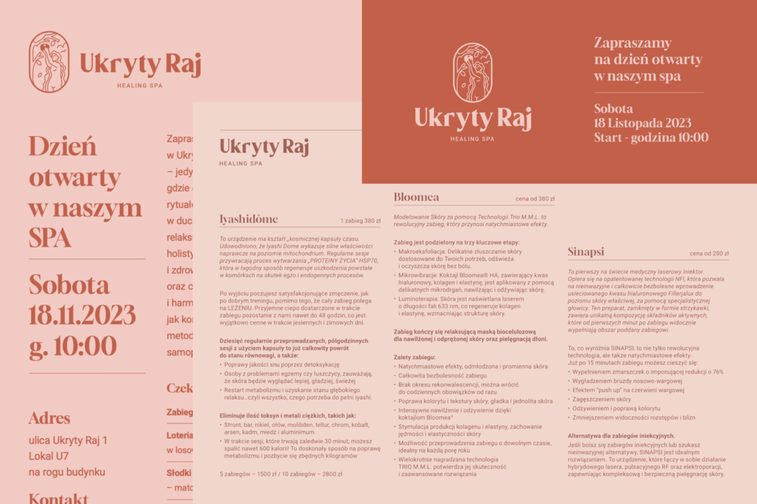 Nazwa tego warszawskiego SPA pochodzi od adresu pod którym się znajduje – na ulicy Ukryty Raj. Wychodząc z takiej symboliki razem stworzyliśmy logo przedstawiające Ewę w chwili kuszenia. Dla Ukrytego Raju wykonałem: znak, zestaw materiałów drukowanych oraz reklamę zewnętrzną. (scroll for english)